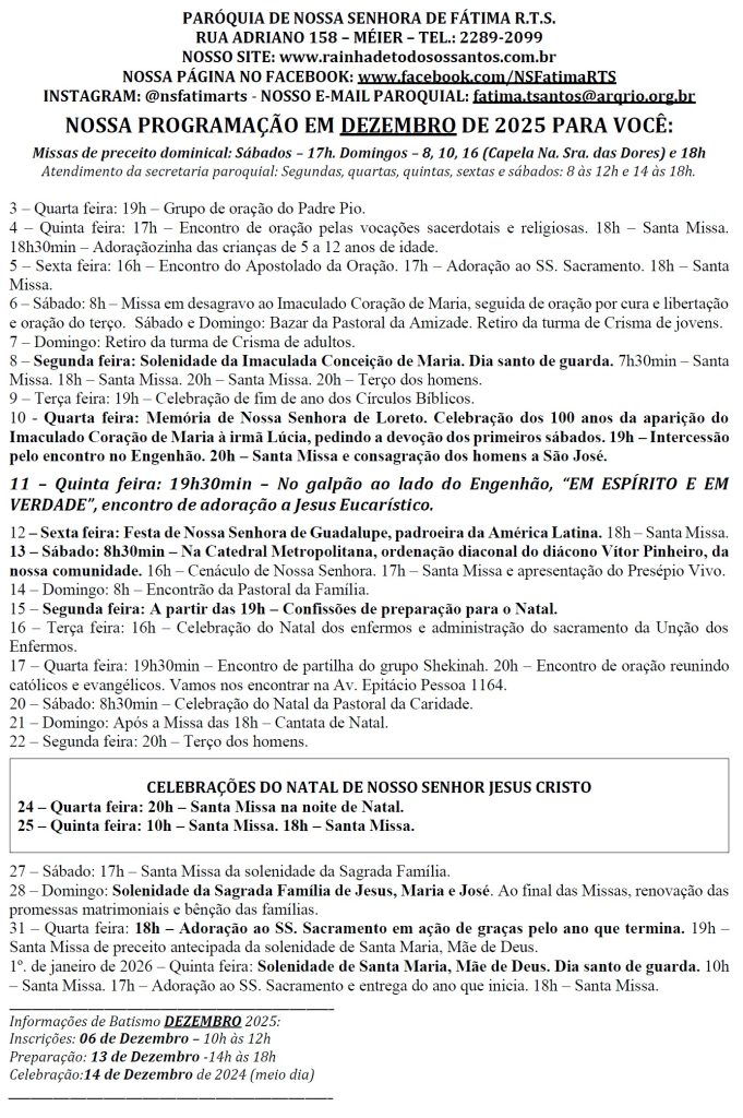 Programa de DEZEMBRO-2025 Pascom 02/12/2025 Agenda Singular: 0 comentário Compartilhe isso:Clique para compartilhar no Twitter(abre em nova janela)Clique para compartilhar no Facebook(abre em nova janela)Clique para compartilhar no WhatsApp(abre em nova janela)Clique para imprimir(abre em nova janela)Clique para enviar um link por e-mail para um amigo(abre em nova janela) Navegação de Post Anterior Post anterior: Homilia 30/11/2025 – 1º Domingo do Advento | Domingo Deixe um comentário Cancelar respostaO seu endereço de e-mail não será publicado. Campos obrigatórios são marcados com *Comentário * Nome * E-mail * Site Salvar meus dados neste navegador para a próxima vez que eu comentar. Notifique-me sobre novos comentários por e-mail. Notifique-me sobre novas publicações por e-mail. Δ